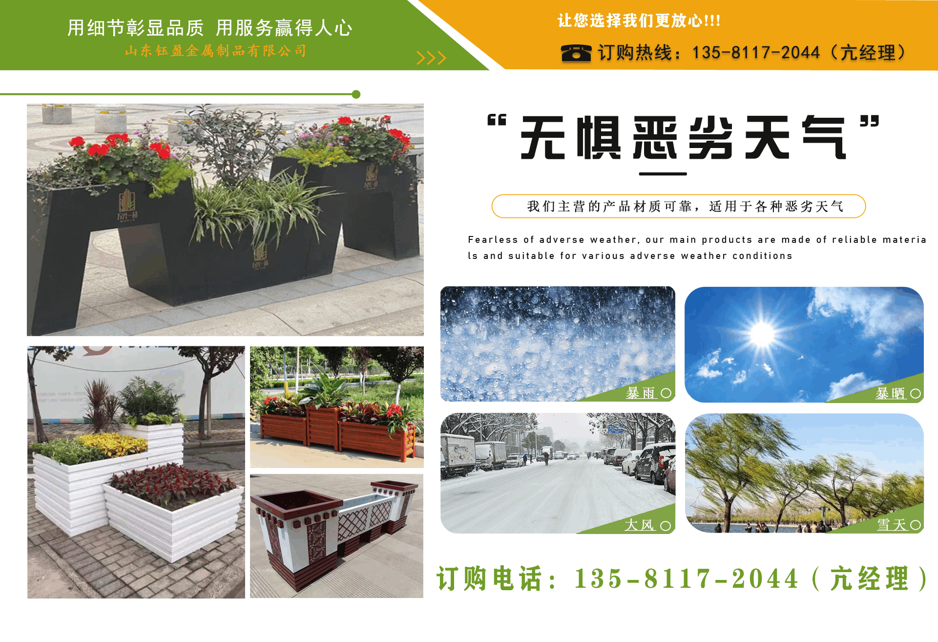 山東鈺盈金屬制品有限公司主營鍍鋅板花箱,道路隔斷花箱,定制花箱,戶外道路花箱,花箱座椅等產(chǎn)品,產(chǎn)品結(jié)構(gòu)合理、性能優(yōu)良,具有強度高、耐腐蝕、抗老化、隔熱隔音、節(jié)約能源、外形美觀、使用壽命長等優(yōu)點,深受國內(nèi)外客戶認可。 我們根據(jù)客戶所在城市的文化特征,制造出符合當?shù)爻鞘形幕瘹庀⒌淖匀涣Ⅲw、觀賞性強的花箱產(chǎn)品成為城市里一道靚麗的風景線?! 」緦嵭姓\實、公正、守信、價格合理、平等互利?! 」緫{借雄厚經(jīng)驗實力,恪守誠信為本的原則,得到了眾多客戶的信賴,并在業(yè)界獲得良好的口碑。建立了穩(wěn)固的合作關(guān)系,隨著業(yè)務(wù)的不斷發(fā)展和壯大,合作伙伴的范圍也在不斷擴大。我們熱情盼望與您的合作,為社會的可持續(xù)發(fā)展獻上一份努力。...